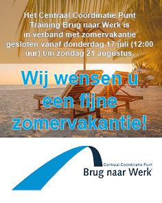 Het Centraal Coördinatie Punt Training Brug naar Werk is in verband met zomervakantie gesloten vanaf donderdagmiddag 17 juli 2025 (12:00 uur) t/m zondag 17 augustus 2025.